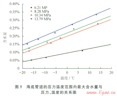 2)雜質(zhì)的存在會對CO2輸送管道的安全運行產(chǎn)生極大的影響,特別是游離水的出現(xiàn)。當輸送過程中含水量超過水的溶解度極限時,管內(nèi)會析出游離水,游離水的出現(xiàn)會對CO2輸送管道的設(shè)計操作、腐蝕及CO2水合物生成產(chǎn)生負面影響,因此,需要設(shè)定CO2輸送管道最大允許含水量的規(guī)范。