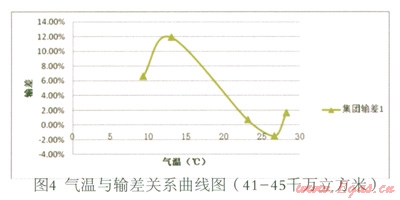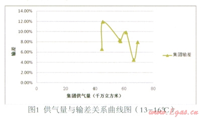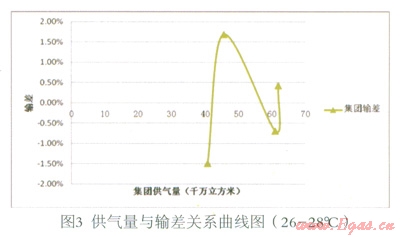 (3)在現(xiàn)有數(shù)據(jù)基礎(chǔ)上,暫未發(fā)現(xiàn)供氣量與輸差之間的明顯函數(shù)關(guān)系。但是,從圖8觀察發(fā)現(xiàn),輸差曲線1、2、3(修正)對應(yīng)的供氣量依次為:41—45、56—60、61—66,單位千萬立方米。隨著供氣量的大幅上升,輸差曲線呈向左下方平移的趨勢。即溫度等其他條件一定的情況下,隨著供氣量的大幅增加,輸差有減小的趨勢。初步分析,可能是由規(guī)模效應(yīng)導致。此推斷是否成立有待進一步的研究,可做為下一研究課題。