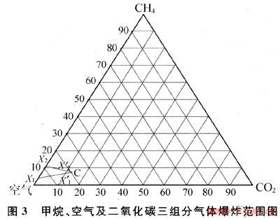 根據(jù)以上實(shí)驗(yàn)結(jié)果,繪制了CH4、CO2及空氣3組分氣體爆炸范圍圖,如圖3所示。經(jīng)檢測(cè)得知可燃?xì)釩H4在含有10%(體積分?jǐn)?shù)) CO2的混合空氣中的爆炸下限和上限分別為(X1、X2)、(X1、X2),三角形X1X2C即為CH4、CO2及空氣3組分氣體爆炸范圍。