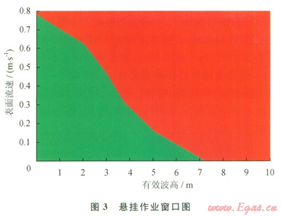 根據(jù)底部殘余張力法確定的l460kN張緊力,針對表3給出的隔水管系統(tǒng)配置并形成詳細(xì)的下放列表,采用前述的海洋環(huán)境條件,通過有限元計(jì)算得到鉆井作業(yè)窗口(2)。