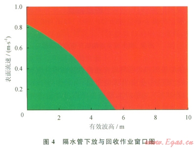 隔水管的下放/回收作業(yè)窗口如圖4所示(具體數(shù)據(jù)略)。圖4中綠色部分為允許作業(yè)區(qū)域,紅色區(qū)域?yàn)椴辉试S在該配置下進(jìn)行下放/回收的環(huán)境條件。