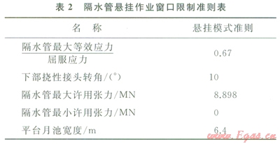 在計(jì)算隔水管懸掛作業(yè)窗口時(shí),同樣也需要首先明確隔水管懸掛作業(yè)窗口的限制準(zhǔn)則,參考相關(guān)研究成果[6,11],確定的隔水管懸掛作業(yè)窗口限制準(zhǔn)則見表2
