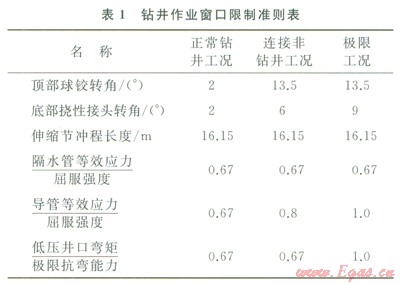 2)隔水管作業(yè)技術(shù)研究主要是依據(jù)設(shè)計(jì)得到的管柱排列和張緊力,結(jié)合給定海域的海況條件和依托平臺的具體情況,同時(shí)也要考慮井口、導(dǎo)管參數(shù)以及土壤條件,確定隔水管鉆井作業(yè)窗口、下放/回收作業(yè)窗口和硬懸掛作業(yè)窗口,確定各個窗口對應(yīng)的極限作業(yè)參數(shù)與極限環(huán)境條件,保證隔水管作業(yè)的安全性。