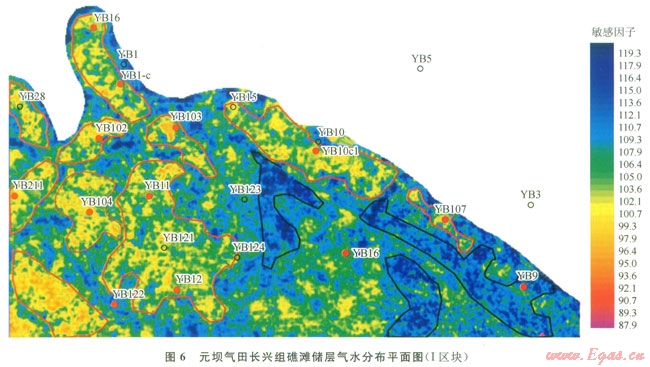 另外從預(yù)測的元壩氣田l區(qū)塊長興組氣水分布平面圖(圖6)來看,整體上有利含氣區(qū)主要分布在西邊及北邊,東南邊多為產(chǎn)水區(qū)及氣水同層區(qū),其刻畫的氣水平面展布與實鉆井揭示的規(guī)律基本上保持一致。從圖6中可以看到:含氣區(qū)(紅黃色區(qū)域)與含水區(qū)(藍色區(qū)域)分布清晰。處于黃色區(qū)域(紅圈內(nèi))的井,均獲得了工業(yè)性氣流。尤其處于紅黃色富集區(qū)域的YBl04井以及YB10cl井,獲得了日產(chǎn)天然氣過百萬立方米的產(chǎn)能。藍色區(qū)域則為含水區(qū)(圖中黑圈內(nèi)),處于該區(qū)域的YB9井在長興組鉆遇水層,日產(chǎn)水30m3。綠色區(qū)域為氣水同層區(qū),該區(qū)域的YBl23井、YBl6井測試結(jié)果既產(chǎn)氣也產(chǎn)水。