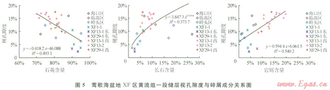 如圖5所示,XF區(qū)黃流組一段儲(chǔ)層的儲(chǔ)集性能與陸源碎屑成分關(guān)系密切,石英含量愈低、長(zhǎng)石與巖屑含量愈高,視面孔率愈高。在黃流組一段沉積時(shí)期,源于昆嵩隆起XFl3-1氣田西部、XFl3-2氣田、XF29-l構(gòu)造西部砂巖,巖屑平均含量在11.8%~l6.2%,以巖屑石英砂巖為主,面孔率平均值為13.9%~l5.6%,以海南隆起物源為主的XFl3-1氣田東部、XF29-1構(gòu)造東部以及XFl-l氣田,各井砂巖石英平均含量大于90%,長(zhǎng)石、巖屑含量低,分別為2.5%~3.8%、3.9%~7.7%,孔隙發(fā)育差,視面孔率僅為2.4%~7.0(1)