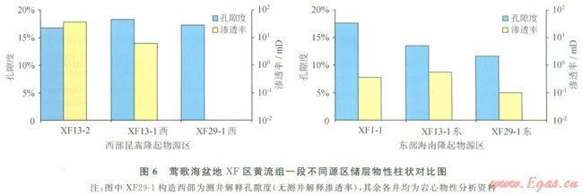 6也展示了由于物源區(qū)的不同造成儲(chǔ)集物性的差異。源于昆嵩隆起物源區(qū)的XFl3-2氣田、XFl3-1氣田西部、XF29-1構(gòu)造西部,巖心物性分析的孔隙度平均為16.8%~l8.3%,滲透率介于6.237.4mD,屬低、中滲型中等至好儲(chǔ)集層。而以海南隆起物源區(qū)為主的XFl-1氣田、XFl3-1氣田東部、XF29-1構(gòu)造東部諸井的儲(chǔ)層巖心孔隙度平均值為ll.7%~l7.6%、滲透率為0.10.5mD,屬低—特低滲型差儲(chǔ)集層或致密層,儲(chǔ)層質(zhì)量明顯劣于西部物源區(qū)。