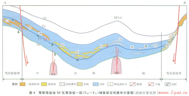 最新高精度生物地層層序及古環(huán)境分析資料顯示,晚中新世黃流組一段沉積時(shí)期,XF區(qū)整體處于相對(duì)平坦、穩(wěn)定的淺海環(huán)境中[2]。以昌化江水系為主的海南隆起物源區(qū)沉積物僅到達(dá)XFl-l構(gòu)造東部,在淺海環(huán)境中形成規(guī)模較小的灘壩沉積(4)[4],砂巖體厚度通常介于642m,粒度細(xì),以粉砂巖為主,巖性較為致密。以藍(lán)江水系為主的昆嵩隆起區(qū)物源體系,發(fā)育規(guī)模較大的三角洲,推進(jìn)至XF區(qū)西側(cè)鶯西斜坡帶上,受鶯西斷裂坡折帶控制,三角洲沉積物在重力作用下被搬運(yùn)到XFl-l構(gòu)造西側(cè)較低洼部位再沉積,形成海底扇水道砂巖復(fù)合體。水道砂巖體單層厚度大多超過l0m,最大單層厚度可達(dá)91.2m,分布廣,延伸至XFl-1底辟構(gòu)造西側(cè),并具有多期次發(fā)育特征[3],以極細(xì)—細(xì)砂巖為主,是XFl3-1、XFl3-2氣出的主力儲(chǔ)層。