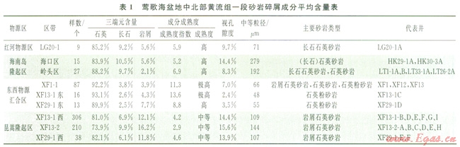 1顯示,盆地中北部黃流組一段時(shí)期總體上以石英砂巖類為主,但不同區(qū)帶的長(zhǎng)石、巖屑含量有差異。鶯東斜坡??趨^(qū)、嶺頭區(qū)長(zhǎng)石平均含量介于9.7%~10.5%,巖屑平均含量介于2.8%~5.8%,以長(zhǎng)石石英砂巖為主,反映以花崗巖為主的海南隆起區(qū)物源性質(zhì);西北部的LG20-1構(gòu)造,其石英、長(zhǎng)石、巖屑含量與鶯東斜坡???、嶺頭區(qū)相近,仍以長(zhǎng)石石英砂巖為主,但其粒度偏細(xì)(平均粒度中值為71mm),為極細(xì)砂,反映離物源區(qū)較遠(yuǎn),從其地理位置來看應(yīng)屬紅河物源體系;XFl3-2氣田、XFl3-1氣田西部、XF29-1構(gòu)造西部則以巖屑石英砂巖較為多見,巖屑平均含量介于11.8%~l6.2(主要為片巖、千枚巖、變質(zhì)砂巖),中等成分成熟度,反映西部昆嵩隆起區(qū)含較多變質(zhì)巖類物源特征;而XFl、XFl2、XFl3、XFl3-1C、XF29-1D井砂巖,粒度細(xì)(粒度中值介于4866mm),長(zhǎng)石、巖屑含量低,平均含量分別為2.5%~3.8%、3.9%~7.7%,石英含量極高(大于90),多為石英粉砂巖,成熟度指數(shù)介于8.813.6,屬高極高成分成熟度,反映這些井區(qū)沉積物經(jīng)過較長(zhǎng)距離的搬運(yùn)。