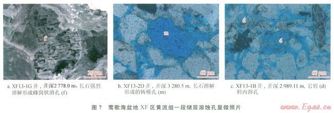 上述分析表明,XF區(qū)黃流組一段儲(chǔ)層除沉積相、成巖作用影響外[4],與物源區(qū)有密切關(guān)系的碎屑組分也是影響儲(chǔ)層質(zhì)量的一個(gè)關(guān)鍵因素。這是由于巖石在深埋過程中,石英組分穩(wěn)定,不易被酸性流體溶蝕,而長(zhǎng)石、巖屑等不穩(wěn)定組分容易發(fā)生溶解,形成各種溶蝕孔(7),增加了儲(chǔ)集層孔隙性,同時(shí)因溶解作用強(qiáng)烈時(shí)形成伸長(zhǎng)狀孔、超大孔可改造孔隙的連通性,提高儲(chǔ)集層滲透率[4]。