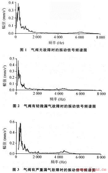 應(yīng)用上述理論方法對壓縮機氣閥典型故障下振動信號進行分析,試驗數(shù)據(jù)來源于塔里木油田某壓縮機,采集氣閥各典型故障下振動信號,采樣頻率FS=16000Hz,數(shù)據(jù)長度N=61440,分別采集典型故障信號各5組,每組10個樣本。圖1~3分別為采集到的氣閥無故障、輕微漏氣、嚴重漏氣故障下的信號頻譜圖(因數(shù)據(jù)較多,僅列出每種典型故障下的1個振動信號樣本的頻譜圖)。