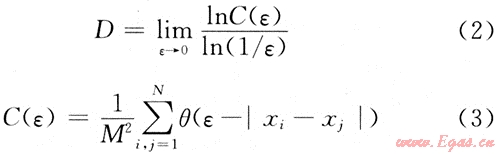 分形維數(shù)有Hausdaorff維數(shù)、相似維數(shù)、容量維數(shù)、信息維數(shù)、關(guān)聯(lián)維數(shù)等幾種形式[10],在機械設(shè)備故障診斷中一般是計算信號的關(guān)聯(lián)維數(shù)。若分形集合中某2點之間的距離為ε,其關(guān)聯(lián)函數(shù)為C(ε),則關(guān)聯(lián)維數(shù)為: