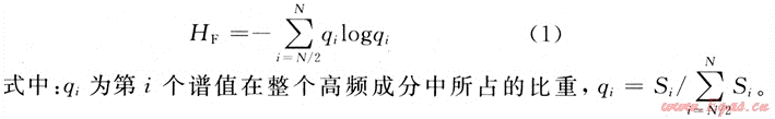 設(shè)Si為信號由時域變換到頻域所對應(yīng)的功率譜,那么S={S1,S2,…,SN)可看作是對原始信號的一種劃分,選定{SN/2,SN/2+1,…,SN)作為高頻成分,根據(jù)文獻[5]對信息熵的解釋,定義高頻譜熵HF為: