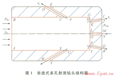 在徑向水平井正常鉆進(jìn)過(guò)程中,向后噴射的高速射流從反向孔眼噴出,射流會(huì)從它周?chē)砦黧w,由于射流鉆頭前面和四周均為巖石,外界流體補(bǔ)充困難,以至在射流鉆頭后部——環(huán)形區(qū)域形成低壓。由于反向射流是多股均勻分布的,所以在一定條件下可在射流鉆頭后端產(chǎn)生一個(gè)密閉環(huán)境的環(huán)形低壓區(qū)。此區(qū)域壓力低于井底環(huán)境壓力,由于壓差作用,會(huì)對(duì)射流鉆頭和高壓軟管產(chǎn)生一個(gè)向前的力,即為反向射流降壓效應(yīng)的自進(jìn)力產(chǎn)生機(jī)理。