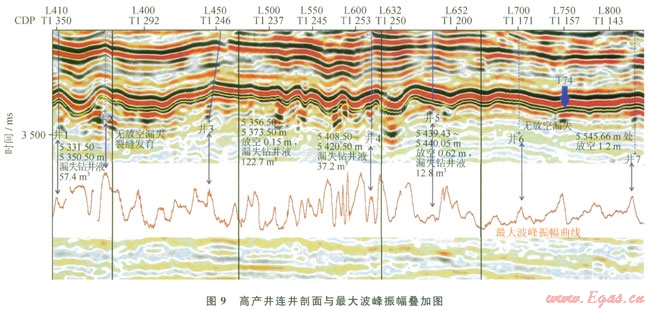圖9為某區(qū)塊連井剖面與其儲層段最大波峰振幅曲線疊合圖。由圖9可見,這些井除井2、井6外,都設(shè)計在“串珠”或“羊排”這些具有溶洞反射特征的位置上,同時它們都對應(yīng)著最大波峰振幅曲線的極大值點(diǎn),且井l、井3、井4、井5和井7都有鉆具放空、鉆井液漏失等表征溶洞發(fā)育的證據(jù),而井2位于兩“串珠”之間,井6未在“串珠”上,這兩口井均無放空漏失現(xiàn)象,即是無溶洞發(fā)育,可見振幅曲線出現(xiàn)極值是溶洞反射特征之一,但并不是所有極值都意味著溶洞發(fā)育。隨著這些井對應(yīng)振幅的減小,其產(chǎn)量總的來說是減小的,而產(chǎn)量作為一種衡量溶洞大小及發(fā)育程度的指標(biāo),可見反射振幅越大的溶洞,其尺寸越大,發(fā)育程度越高,這與前面的結(jié)論是相符合的。所以通過這種手段識別溶洞,可指導(dǎo)實際生產(chǎn),提高鉆探成功率。