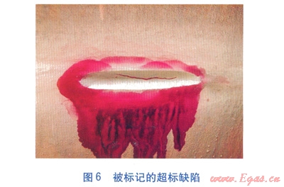 在特種設(shè)備檢測(cè)機(jī)構(gòu)對(duì)球罐全面檢測(cè)后,對(duì)超標(biāo)缺陷進(jìn)行分析、標(biāo)記,球罐管理單位需對(duì)超標(biāo)缺陷進(jìn)行返修,直至特種設(shè)備檢測(cè)機(jī)構(gòu)對(duì)返修后的缺陷檢測(cè)復(fù)核合格為止。超標(biāo)缺陷返修處理難度大,技術(shù)要求高,返修方案須經(jīng)過(guò)原設(shè)計(jì)單位或者具備相應(yīng)資質(zhì)的設(shè)計(jì)單位同意,是開(kāi)罐檢驗(yàn)過(guò)程中的最大難點(diǎn)。被標(biāo)記的超標(biāo)缺陷見(jiàn)圖6。