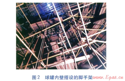 球罐直徑大(如容積為l000m3的球罐內(nèi)直徑為12.3m,容積為l0000m3的球罐內(nèi)直徑為27m),罐頂離地面距離大。GB/T 3608—2008((高處作業(yè)分級(jí)》規(guī)定,在距墜落高度基準(zhǔn)面2m及以上有可能墜落的作業(yè)均屬于高空作業(yè)。因此開(kāi)罐檢驗(yàn)為高空作業(yè),為了保障施工人員的安全,球罐內(nèi)外壁必須搭設(shè)腳手架。球罐內(nèi)、外壁搭設(shè)的腳手架分別見(jiàn)圖2、3。