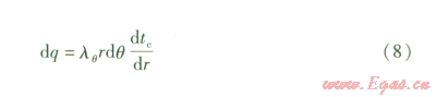 由邊界條件:當(dāng)r=0.2645m時(shí),微元弧面溫度為270℃;當(dāng)r= rq時(shí),微元弧面溫度為l℃,可求得式(8)在dq內(nèi)的解為: