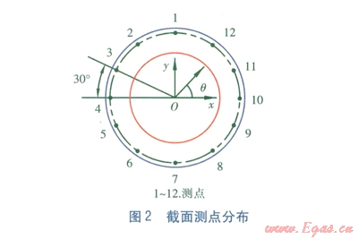 分別對(duì)垂直安裝與水平安裝的供熱管道進(jìn)行測(cè)溫,截面設(shè)12個(gè)測(cè)點(diǎn)(見圖2),12個(gè)測(cè)點(diǎn)均勻分布,測(cè)點(diǎn)與絕熱層外表面的距離為20mm,所選擇的測(cè)溫截面的絕熱材料比較均勻。垂直與水平兩種安裝方式下的測(cè)點(diǎn)溫度見表1。由表1可知:對(duì)于垂直安裝供熱管道,l2個(gè)測(cè)點(diǎn)的平均溫度為37.18℃。對(duì)于水平安裝供熱管道,12個(gè)測(cè)點(diǎn)的平均溫度為37.85℃。對(duì)于兩種安裝方式,雖然測(cè)點(diǎn)平均溫度基本一致,但是水平安裝供熱管道測(cè)點(diǎn)l的溫度最高,比測(cè)點(diǎn)7的溫度高9.2℃,這說(shuō)明水平安裝供熱管道的絕熱層熱導(dǎo)率有明顯的方向性。