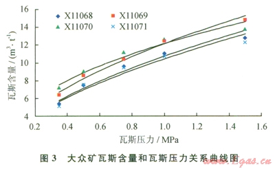 3)實驗室研究了瓦斯含量和瓦斯壓力的相互關(guān)系,龍山礦無煙煤瓦斯壓力0.74MPa對應(yīng)的瓦斯含量為l0.9~12.6m3/t,最低為l0.9m3/t;大眾礦貧煤對應(yīng)的瓦斯含量為9.04~10.7m3/t,最低為9.04m3/t。