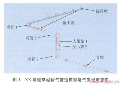 根據(jù)XX隧道穿越管道設(shè)計(jì)資料,隧道穿越的總長(zhǎng)度為2246.7m,隧道內(nèi)全部采用露空與管架支撐形式,在隧道進(jìn)口和出口處分別設(shè)置錨固墩l和錨固墩3,用以截?cái)嗨淼劳夤艿缹?duì)隧道內(nèi)管道的影響。隧道進(jìn)口豎井深度為26.87m,支吊架2個(gè)(第1個(gè)支吊架距隧道進(jìn)口處5.4m),2個(gè)支吊架間距為2.816m;平巷長(zhǎng)度為2160m,平巷內(nèi)設(shè)置支墩,支墩間距為l2m,共設(shè)置支墩l81個(gè);隧道出口豎井深度為18.32m,支吊架l個(gè)(距隧道出口處6.624m);管道彎管處的曲率半徑為6D(D為管道外徑)。管道的材料為L485,管徑為914mm,壁厚為22.2mm,彎管壁厚為23.8mm。根據(jù)式(1)計(jì)算得到試驗(yàn)壓力(pt)為21.2MPa。XX隧道豎井盾構(gòu)穿越輸氣管道具體布局如圖1所示。