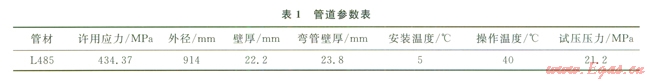 以XX隧道穿越管道為例,根據(jù)SY/T0015.1-1998《原油和天然氣輸送管道穿跨越工程設(shè)計(jì)規(guī)范穿越工程》6.2.2計(jì)算得到管道的試壓壓力為21.2MPa,試壓介質(zhì)為清水,試壓溫度為20℃,輸氣管道的工作溫度為40℃,建立試壓工況下的應(yīng)力分析模型。表l為該管道的參數(shù)表。