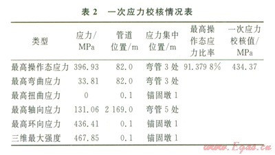1)在試壓工況下的一次應(yīng)力和綜合應(yīng)力校核中,最大應(yīng)力產(chǎn)生的位置都在管道的彎管3處,產(chǎn)生最大二次應(yīng)力的位置在管道的彎管2處,說(shuō)明彎管是應(yīng)力危險(xiǎn)截面處。