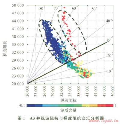 圖l為Y氣田目的層段的縱波阻抗(AI)和梯度阻抗(GI)交匯圖,其中色標(biāo)為泥質(zhì)含量(Vsh),可以看出30°的擴(kuò)展彈性阻抗可以較好地區(qū)分砂巖與泥巖。