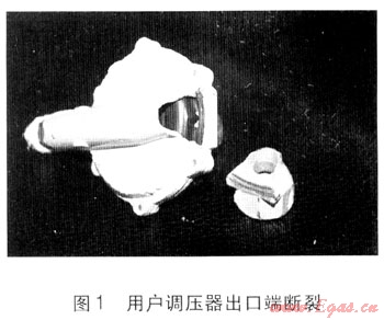 調(diào)壓器本體泄漏,包括本體進出口端開裂、斷裂(見圖1)、閥蓋破裂、本體與螺紋接頭處泄漏等。調(diào)壓器本體所用材質(zhì)主要是生鋁,韌性不足,閥體厚度(約2mm左右)不足,制造工藝缺陷造成調(diào)壓器本身質(zhì)量問題;其次,本體與螺紋接頭采用金屬膠粘合連接,其強度較低,如果安裝人員沒有正確安裝操作,會導(dǎo)致粘合部位受損或嚴密性達不到要求;再次,由于采用硬連接,隨環(huán)境溫度變化和建筑物沉降,調(diào)壓器連接處發(fā)生伸縮彎曲而受應(yīng)力作用,從而造成泄漏。