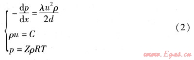 相對于其他項數(shù)值較小,可以忽略[11]。b.在城市燃氣管網(wǎng)中,管道的標高差值不太大,因此,動量方程中的重力項g(ρ-ρa)sinα一般忽略不計。