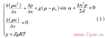 管道內(nèi)氣體流動數(shù)學模型由動量方程、連續(xù)性方程、狀態(tài)方程組成[10],見式(1)。因為管道內(nèi)溫度變化很小,所以不考慮能量方程。