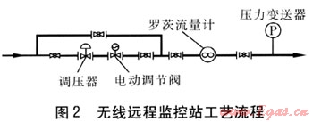 無(wú)線遠(yuǎn)程監(jiān)控站是在原有的區(qū)域中-低壓調(diào)壓站的基礎(chǔ)上,通過(guò)工藝改造增設(shè)羅茨流量計(jì)、壓力變送器、電動(dòng)調(diào)節(jié)閥、無(wú)線數(shù)據(jù)采集器(RTU)、后備電源以及無(wú)線數(shù)傳Modem構(gòu)成。無(wú)線遠(yuǎn)程監(jiān)控站工藝流程見(jiàn)圖2。無(wú)線數(shù)據(jù)采集器是一種具有采集、處理功能的自動(dòng)化設(shè)備,專門針對(duì)低功耗、無(wú)人值守站而設(shè)計(jì),與流量計(jì)、壓力傳感器、電動(dòng)閥門上的數(shù)據(jù)通信接口相連接,按內(nèi)置程序采集數(shù)據(jù)后,執(zhí)行操作指令上傳數(shù)據(jù),由無(wú)線數(shù)傳Modem接收信號(hào)并解碼壓縮后將信號(hào)傳回監(jiān)控中心的工控機(jī)。在后備電源的支持下,能夠保證系統(tǒng)在斷電的情況下正常運(yùn)行48h。