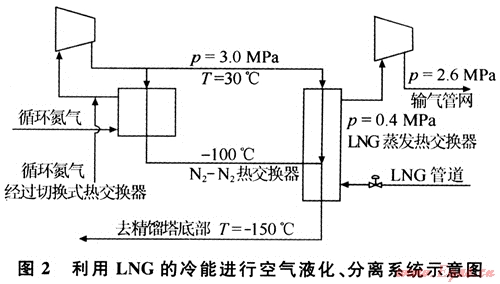 常用的空氣分離法是將空氣液化,通過氟利昂冷凍機、透平膨脹機進(jìn)行空氣的液化和分離,制成液態(tài)的氮氣、氧氣、氬氣等。而LNG冷熱能用于空氣分離則是通過循環(huán)氮氣的冷卻來實現(xiàn)(見圖2)。一般來說,生產(chǎn)10×104m3的液態(tài)氣體大約需要650×104kJ的冷卻能。利用LNG的冷熱能,循環(huán)氮氣壓縮機可小型化;因不需要冷凍機,建設(shè)費用也可相應(yīng)減少;此外,LNG作為空氣分離裝置的預(yù)冷劑,生產(chǎn)液氬的空分裝置中,利用其冷能冷卻和液化由下塔抽出經(jīng)過復(fù)熱的循環(huán)氮,可以省去氟利昂制冷機以及氮透平膨脹機組,使產(chǎn)品能耗平均降低0.5kwh/m3,裝置的投資費用可減少10%左右,生產(chǎn)成本降低20%~30%。