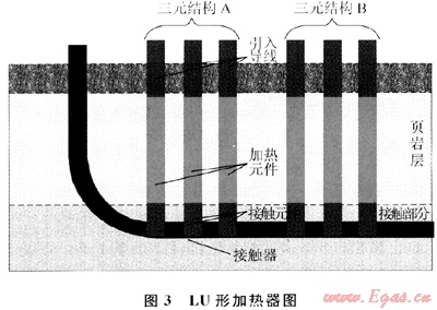 為了降低加熱器的成本,LU形加熱器沿直線方向布置3個(gè)加熱器(圖3)。引入導(dǎo)線將加熱元件耦聯(lián)到地層表面上。加熱元件耦聯(lián)到位于地層的底層上或附近的接觸元件。接觸元件耦聯(lián)到接觸部分中的接觸器上,以使支腿間彼此電氣耦聯(lián)以形成三元結(jié)構(gòu)。三元結(jié)構(gòu)耦聯(lián)到水平連接井。該加熱器的優(yōu)點(diǎn)是電氣耦聯(lián)多樣化,較易實(shí)施,缺點(diǎn)是直線排布三元結(jié)構(gòu)不利于加熱頁巖層。