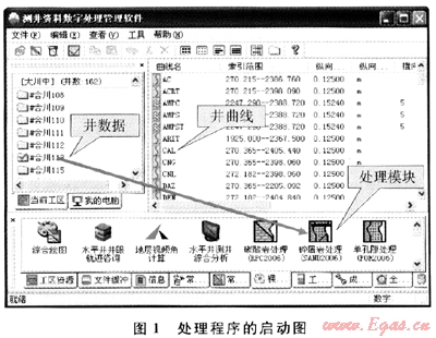 處理程序在設(shè)計(jì)時,應(yīng)用了Windows系統(tǒng)的拖放功能實(shí)現(xiàn)對數(shù)據(jù)的調(diào)度,只要將井?dāng)?shù)據(jù)拖到相應(yīng)處理模塊圖標(biāo)上,則可應(yīng)用該模塊進(jìn)行處理(圖1)。
