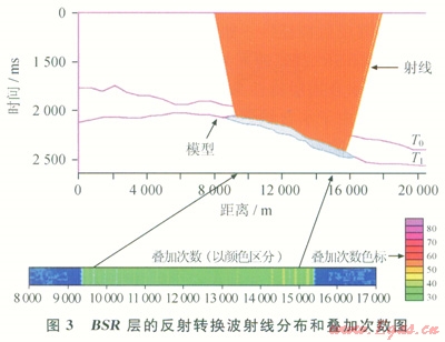 通過目標體的二維地震剖面,按HF-OBS分布間距,通過射線追蹤模擬,分析縱、橫波接收情況,根據(jù)覆蓋次數(shù)與均勻程度,選取最佳的覆蓋效果(圖3)。圖中藍色表示水合物目標體(剖面),射線所指的紅色區(qū)域表示所對應的反射轉(zhuǎn)換波射線分布區(qū)域。通過對HF-OBS分布間距為100m、200m、300m、400m、500m、600m、700m和1000m等情況下模擬得到的幾組數(shù)據(jù)的分析比較,分別計算落入不同距離的線段內(nèi)的疊加次數(shù),并用色標進行表示,然后分析疊加次數(shù)的均勻程度和覆蓋效果。當HF-OBS分布間距在500m以下時(300~400m效果最佳),線段內(nèi)的疊加次數(shù)達超過30次,并且疊加次數(shù)的分布比較均勻。最后,確定HF-OBS臺站間距小于500m時效果較好,且分布間距愈小,所使用的HF-OBS臺數(shù)愈多,疊加次數(shù)愈高,覆蓋效果愈好。