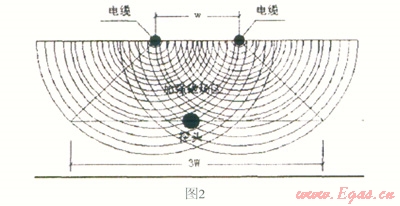 采用人工磁場,即在穿越中心線兩側布設的閉合線圈,這樣所布線圈不受外部磁場的干擾,可以準確無誤的將鉆孔數據反映出來,當探頭到達此閉合的線圈區(qū)域內,接通直流電源產生磁場,通過人工磁場可以測得穿越軸線的左右偏移和穿越標高(如圖2,W為單位寬度)。由于人工磁場受干擾較小,可以提供準確的管線穿越方位角,從而能夠很好的控制導向孔與設計穿越曲線偏移,并能保證穿越曲線的平滑性。