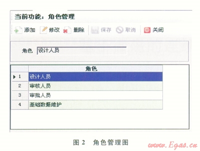 該系統(tǒng)分為角色管理、角色權(quán)限管理以及用戶管理3個(gè)部分。角色管理把使用系統(tǒng)的人員分為設(shè)計(jì)人員、審核人員、審批人員和基礎(chǔ)數(shù)據(jù)維護(hù)員(圖2)。這些人員能進(jìn)行的業(yè)務(wù)處理和所能查看的數(shù)據(jù)范圍各不相同,系統(tǒng)需要為每一個(gè)操作人員設(shè)立不同的賬號(hào),系統(tǒng)為每個(gè)角色分配相應(yīng)的操作權(quán)限(圖3)。