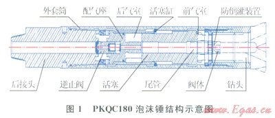 空氣錘在油氣田“防斜打快”應(yīng)用中逐步成熟[1-3],應(yīng)用范圍從傳統(tǒng)防斜提速開始向定向鉆井發(fā)展[4]。但也還存在鉆遇地層出水,空氣錘易出現(xiàn)輸出功率低或不工作的問題[5]及地層液體倒灌氣缸污染空氣錘問題。國內(nèi)外曾在泡沫介質(zhì)中應(yīng)用空氣錘鉆進(jìn)[6-7],但主要限于淺地層,井底壓力較小,對(duì)空氣錘輸出功率影響程度較小。在油氣鉆井行業(yè),由于井深大,使用霧化或泡沫后井底壓力相對(duì)純氣體高,對(duì)常規(guī)空氣錘輸出功率影響較大,有必要同時(shí)發(fā)展適應(yīng)于氣體(干氣)和霧化或泡沫(濕氣)鉆井介質(zhì)的泡沫錘技術(shù)。為此,筆者主要介紹了泡沫錘的研制背景、結(jié)構(gòu)及性能特點(diǎn)以及在現(xiàn)場(chǎng)中的應(yīng)用效果。時(shí)導(dǎo)致空氣錘無輸出功率;針對(duì)此問題提出了綜合優(yōu)化后氣室初始體積、優(yōu)化尾管結(jié)構(gòu)尺寸、優(yōu)化動(dòng)力單元間隙的技術(shù)建議。
