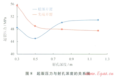 根據(jù)裂縫起裂壓力與射孔深度的關(guān)系(圖8) [7],從射孔根部起裂時(shí),隨著孔深增加,起裂壓力先減小后增加,射孔深度為0.5m時(shí),起裂壓力最低。因?yàn)榭咨钶^小時(shí),鉆井引起的近井筒應(yīng)力變化沒消除,限制了裂縫起裂,所以起裂壓力增加;當(dāng)孔深增大時(shí),孔眼尖端不受近井筒應(yīng)力的影響,所以孔眼根部起裂壓力降低。當(dāng)射孔深度超過0.5m時(shí),孔眼尖端與根部的應(yīng)力區(qū)相互影響較小,起裂壓力增加;但當(dāng)孔眼深度達(dá)到0.8m后,起裂壓力增加不明顯。表明孔深達(dá)到一定深度以后,孔眼尖端與根部應(yīng)力相互影響消失,起裂壓力小再隨孔深增加而增加或增加不明顯。