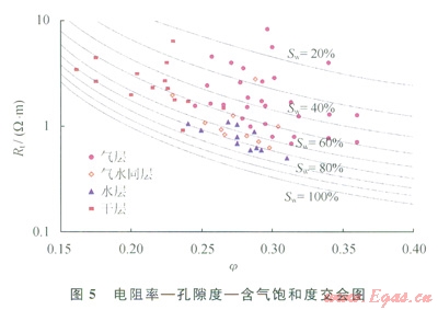 (6)、(7)分別為孔隙結(jié)構(gòu)指數(shù)(m)和飽和度指數(shù)(n)的計(jì)算公式,利用修正的阿爾奇公式計(jì)算Sw,并建立電阻率孔隙度  含氣飽和度交會(huì)圖,能夠較好地識(shí)別氣水層(5)