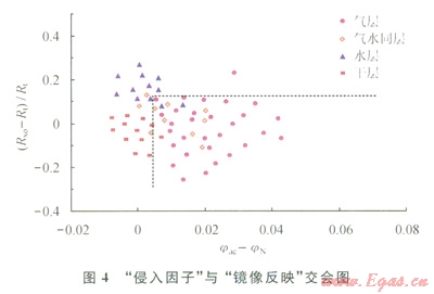 結(jié)合基于淡水鉆井液侵入特征分析以及聲波孔隙度和中子孔隙度的“鏡像反映”特征。通過(guò)引入“侵入因子”[(Rxo-Rt)Rt],其中Rxo、Rt分別為中、深感應(yīng)測(cè)井值,建立“侵入因子”與“鏡像反映”(jac-jN)的交會(huì)圖,可以有效地識(shí)別氣水層(4)。