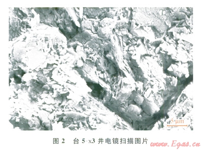 黏土礦物中以蒙脫石、伊蒙混層礦物以及伊利石的附加導(dǎo)電作用最為顯著,當(dāng)吸附陽(yáng)離子的數(shù)量(即巖石表面的陽(yáng)離子交換容量)較大時(shí),吸附陽(yáng)離子的附加導(dǎo)電作用非常顯著,可以使氣層電阻率明顯降低,甚至形成低阻氣層[7-10]。根據(jù)掃描電鏡資料(2),臺(tái)南氣田儲(chǔ)層中可分別識(shí)別出蒙脫石、伊一蒙混層、伊利石、高嶺石、綠泥石以及少量綠蒙混層等自生黏土礦物,它們分布于粒表或粒間。通過(guò)統(tǒng)計(jì)臺(tái)5-x3、臺(tái)6-x8、臺(tái)試x53口井各層位的黏土礦物相對(duì)含最發(fā)現(xiàn),臺(tái)6-x8蒙皂石平均含量11.9%,伊利石43%,臺(tái)試x5和臺(tái)5-x3井不含蒙皂石,但伊利石和伊/蒙混層均比較高,臺(tái)試x5井伊/蒙混層含量高達(dá)43.8%,伊/蒙混層和伊利石平均含量在54%以上,可能存在黏土附加導(dǎo)電作用。