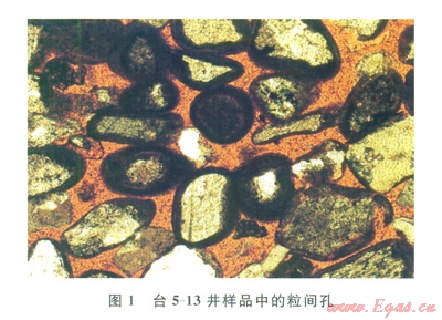 微觀孔隙的大小及其分布特征決定了束縛水飽和度的高低,同時(shí),由于親水性強(qiáng)的黏土礦物的填充進(jìn)一步改造了粒間孔隙,造成微孔隙的增加,巖石內(nèi)比面的增大,薄膜滯水增多,含水飽和度增加。臺(tái)南氣田儲(chǔ)層孔隙類以原生孔隙為主,僅有少量的次生孔隙。原生孔隙主要為原生粒間孔,其次為雜基內(nèi)微孔;次生孔隙主要為溶孔,有少量裂縫發(fā)育。通過(guò)臺(tái)5-x3及臺(tái)試x5井鑄體薄片(1)對(duì)孔隙類型的統(tǒng)計(jì)表明,發(fā)現(xiàn)孔隙結(jié)構(gòu)中84.78%為粒間孔,13.04%為微裂縫;喉道類型以縮頸型喉道為主,少量微喉道,孔徑分布一般在0.11mm之間,面孔率在1%~15%之間。分析表明,臺(tái)試5井孔隙以粒間孔為主,孔隙半徑比較細(xì),微孔隙比較發(fā)育,發(fā)育少量微裂縫。
