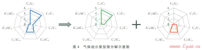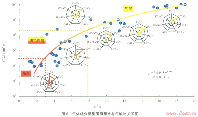 2)氣體組分星型圖面積sa與輕質(zhì)組分含量有關(guān),面積Sb與重質(zhì)組分含量有關(guān),其面積比SaSb與氣油比有很好的對應(yīng)關(guān)系,面積比SaSb越大,氣油比越高。