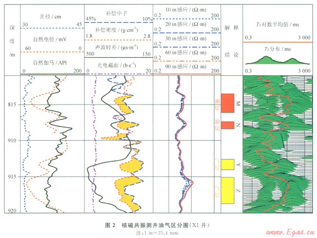 2X1井的核磁共振測井油氣區(qū)分圖,M、N層的T2譜具有較明顯的拖尾現(xiàn)象,部分信號超過了1000ms,判別為油層;Y、Z層的T2譜弛豫時間則基本小于1000ms,判別為氣層。核磁共振測井區(qū)分油氣效果較好,但由于價格昂貴且測速慢,只有少部分井的重點層段進行了核磁共振測井,因此該方法難以廣泛使用。