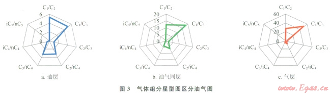 在對比上述多種方法的優(yōu)缺點以及它們在英東油氣田的試用情況后,提出了氣體組分星型圖來區(qū)分油層和氣層,該方法在英東油氣田使用效果最好,它采用C1C1C1C3、C2C3C2iC4、C3iC4、iC4nC4、iC5nC57項比值,充分利用了氣測錄井數(shù)據(jù),能準確地區(qū)分油層、油氣同層、氣層。通過測試、生產(chǎn)等數(shù)據(jù)的檢驗,氣體組分星型圖的判別符合率超過90(3)