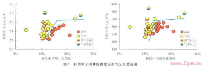 補償中子挖掘效應(yīng)方法認為氣層補償中子孔隙度會降低,而聲波和密度視孔隙度會增高,因此氣層的補償中子孔隙度與聲波或密度視孔隙度之間會存在一定差異。然而不同氣層的地層壓力、含氫指數(shù)、密度等是有差別的[7];同時,泥質(zhì)含量的高低、儲層巖屑成分含量的變化等因素都會影響三孔隙度曲線,從而在一定程度上掩蓋氣的響應(yīng);另外砂泥巖地層中頻繁出現(xiàn)的擴徑現(xiàn)象也會導(dǎo)致三孔隙度曲線質(zhì)量降低。圖1為補償測井挖掘效應(yīng)油氣區(qū)分交會圖,在井徑規(guī)則,三孔隙度曲線質(zhì)量合格的井段,有一定效果,但無法區(qū)分油氣同層。