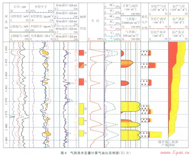 6為英東油氣田X2井氣測錄井定量計算氣油比的實例。井深14501485m,常規(guī)測井挖掘效應(yīng)”區(qū)分油氣效果較差,無論油層還是氣層密度—中子的“鏡像特征”相差不大。該井投產(chǎn)時,A—F6個層一起射開,5mm油嘴自噴,平均日產(chǎn)油9.74m3、氣9602m3、水0.13m3。氣測錄井氣體組分星型圖判別A、B、C為油層油氣層,其氣油比分別約為36m3m3、2000m3m3、180m3m3D、EF為氣層,其氣油比分別約為48000m3m3、27000m3m3、37000m3m3;計算結(jié)果與超聲波三相流產(chǎn)液剖面基本一致。