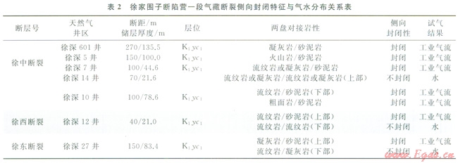 由表l中可以看出,徐家圍子斷陷日前已發(fā)現(xiàn)的氣藏,如徐深1—徐深6井區(qū)、徐深7井區(qū)、徐深41徐深l7井區(qū)、徐深14—徐深l2井區(qū)、徐深12井區(qū)、徐深27井區(qū)、徐深9井區(qū)、徐深l3—肇深11井區(qū)營一段火山巖氣藏皆為受三大斷裂遮擋形成的氣藏,其在天然氣運聚成藏期——青山口組沉積之后至今在側(cè)向上是否封閉是決定氣藏能否形成的關(guān)鍵。