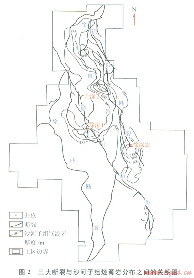 氣源對比結(jié)果[13-14]表明,徐家圍子斷陷天然氣主要來自沙河子組煤系烴源巖。由圖2中可以看出,徐家圍子斷陷沙河子組煤系烴源巖分布明顯受到三大斷裂分布的控制,沙河子組烴源巖發(fā)育以下3個厚度高值區(qū):①分布于徐西斷裂北段與徐東斷裂之間的升深2井北部,沙河子組烴源巖最大厚度可超過1000m;②分布于徐西斷裂北段與徐中斷裂之間的徐深l井處,沙河子組烴源巖最大厚度可超過800m;分布在徐西斷裂南段與徐東斷裂之間的徐深21井南部,沙河子組烴源巖最大厚度可超過1000m。